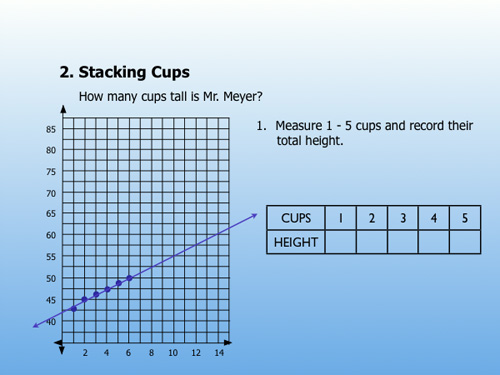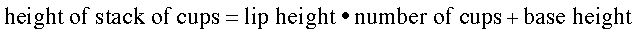 You should hover your group interaction around the idea of slope and y-intercept. The slope here is the lip of the cup: how much the height increases every time you add a cup. The y-intercept is everything that isn’t the lip (the base). Your equation is: