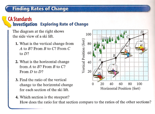 The fact is that dead-tree textbooks are at a disadvantage here. Like I said before, I am generally uninspired by my textbook’s perfunctory stabs at real-world relevance but even when the textbook stumbles over an interesting image (a ski lift, for instance) the nature of paper means they must apply the entire mathematical framework – the labeled points, the grid, the scaled axes, and the questions – before the student has even given the image a first glance.