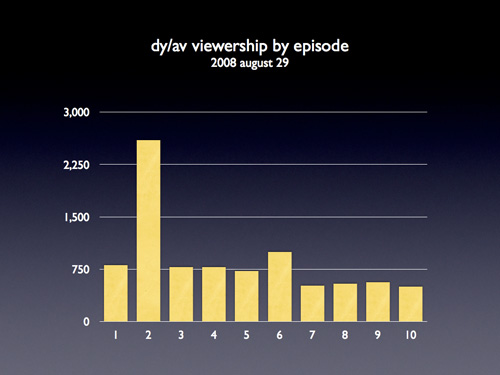 The most watched episode was dy/av : 002 : the next-gen lecturer, the popularity of which surprised and, frankly, annoyed the hell outta me. I paced the ten episodes according to which ones I felt would play like gangbusters and which I felt would lull an audience appropriately. Turns out I have no idea what any of you people are into.