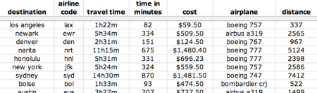 March 10, 2008 - 10:02 am -My father works as the Aircraft PowerPlant Manager (AKA, he is in charge of the engines) at SFO for United so I was tipped to this post. You might want to expand it to San Jose and Oakland and maybe discuss why those flight times and prices also vary compared to SFO. Maybe even have those really energetic students look at Sacramento, which some people have been known to travel out of because they find SJO or OAK too congested.