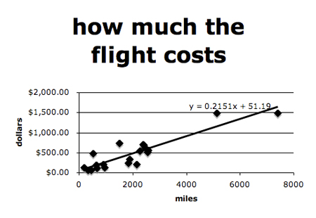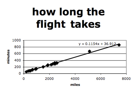 I think that you’re right if we did trips within our own urban area, it would be a much more scattered plot. In reality, I’m starting to suspect that Mapquest just has some very linear function (with a y-intercept of zero) that calculates their estimated travel time. In other words, our best fit lines were mighty good because they really do fit on a straight line! BTW, how do you find the miles of each of your plane trips (I don’t think that the airline web pages show you that, do they?).