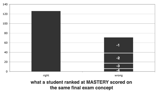 But what if I had given them all fifteen of those concepts again. How accurate is my ranking not just of those three kids but of all of my kids? I have ranked everyone on a four point scale on each of those concepts. Will a student ranked at 2 (“major conceptual errors”) again score a 2?