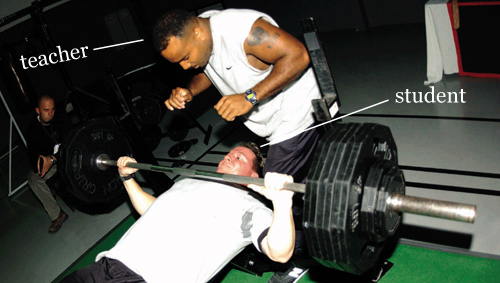The good teacher puts weight on the student’s intellectual bar and lets her struggle under that weight as long as possible, asking questions to help her cut through the confusion, just like the spotter shouts encouragement at the lifter.