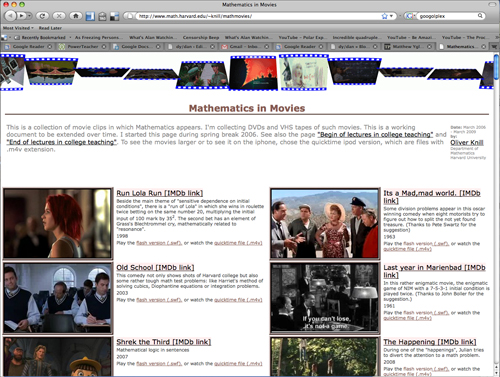 Harvard’s Oliver Knill extracts clips from movies that evoke math. To whomever first tipped me to this site last year and for the dozen recommendations I have received since, thanks, but I have no idea what to do with it. There is value here, certainly, but rarely is it of the WCYDWT? variety, which has kids actually getting dirty with math.