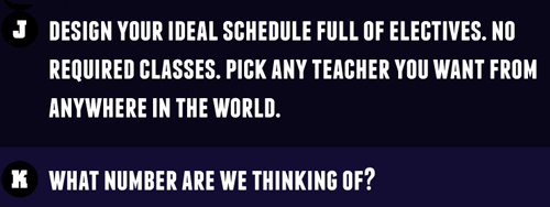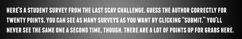Pause for breath. A brief survey with questions about the scav, questions about who you were friends with as a little kid, and one bit where we asked students to design their ideal school schedule full of electives taught by anybody from anywhere in the world. (“Do they have to be alive?” a contestant asked via e-mail.)
