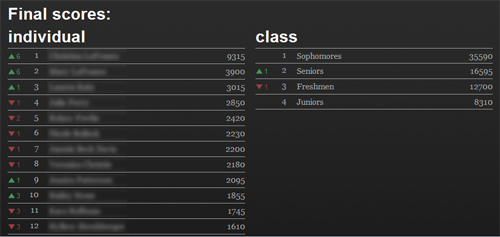 We did assign points to challenges and we kept a running scoreboard for both individuals and classes (ie. “Are the freshmen beating the seniors?” etc.). Andy rigged the scoreboard to track ranking movement a lá Billboard’s music charts. (ie. “Marco Polo rose 17 rankings in the charts today.”) These efforts were all well received by the contestants.