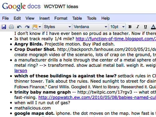 Most of my teaching strays only four or five degrees from the path beaten by my textbooks. We do a full WCYDWT unit – the kind of home run that I post here – perhaps once every two weeks. Naturally, that pace picks up every school year as I swap out old parts for new and as more of y’all do that hard work for me.