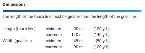 One thing there: according to FIFA’s Laws of the Game, the dimensions that satisfy the math problem – eighty yards by eighty yards – aren’t legal: