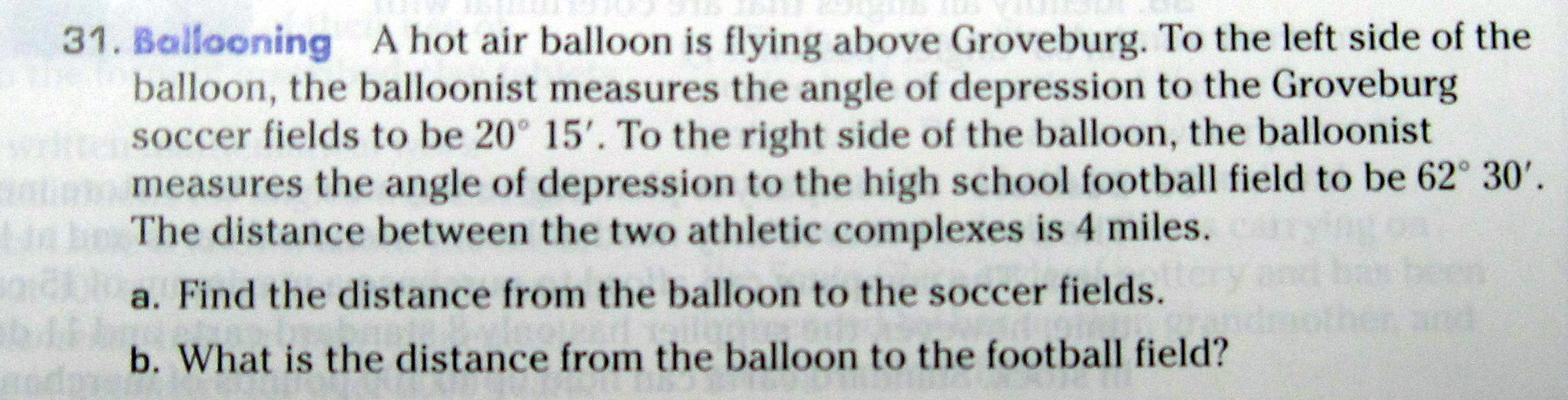 A hot air balloon is flying above Groveburg. To the left side of the balloon, the balloonist measures the angle of depression to the Groveburg soccer fields to be 20ยฐ 15′. To the right side of the balloon, the balloonist measures the angle of depression to the high school football field to be 62ยฐ 30′. The distance between the two athletic complexes is 4 miles.