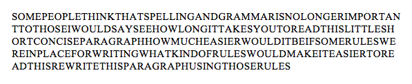 The original Greek texts [of the New Testament] were written in all capital letters with no spacing and no punctuation. I wondered what would happen if I gave kids the note below on the first day of class?