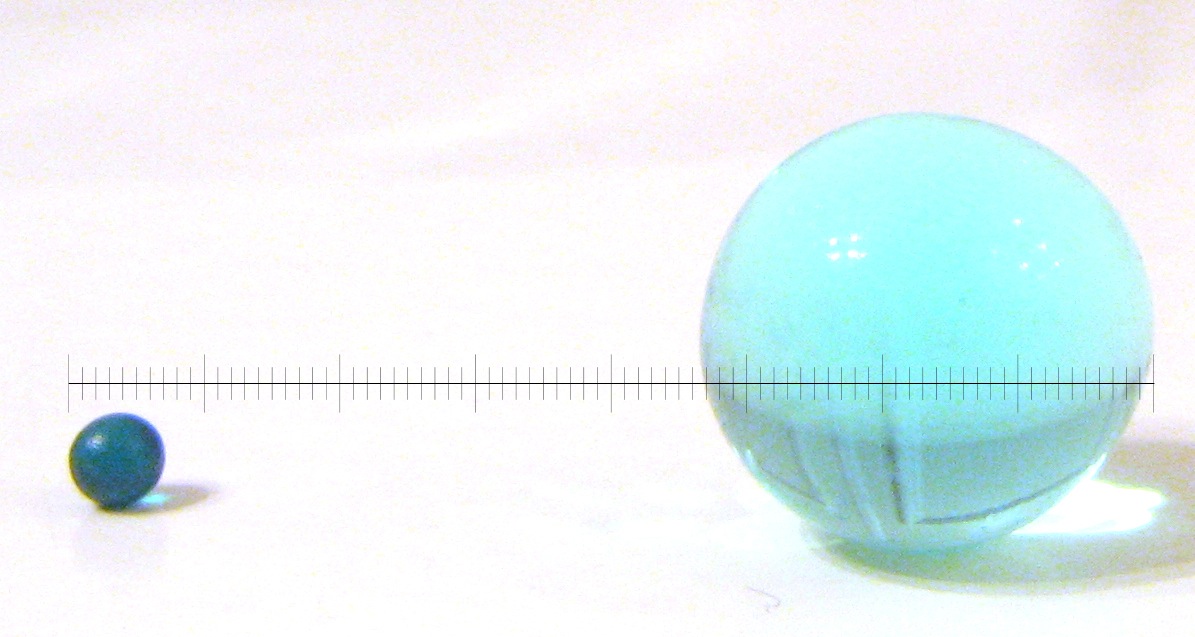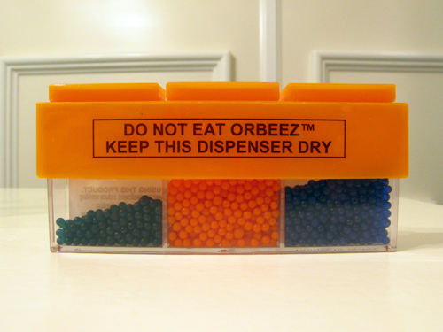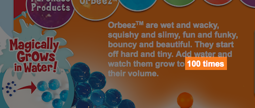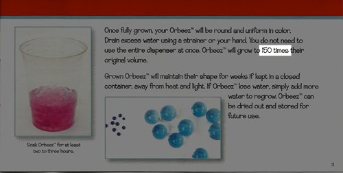 Basically, small things that grow big in water. The Orbeez website puts the volume increase at a factor of 100 while the instructional manual puts it at 150. Controversy! Which is right? Or are they both wrong?