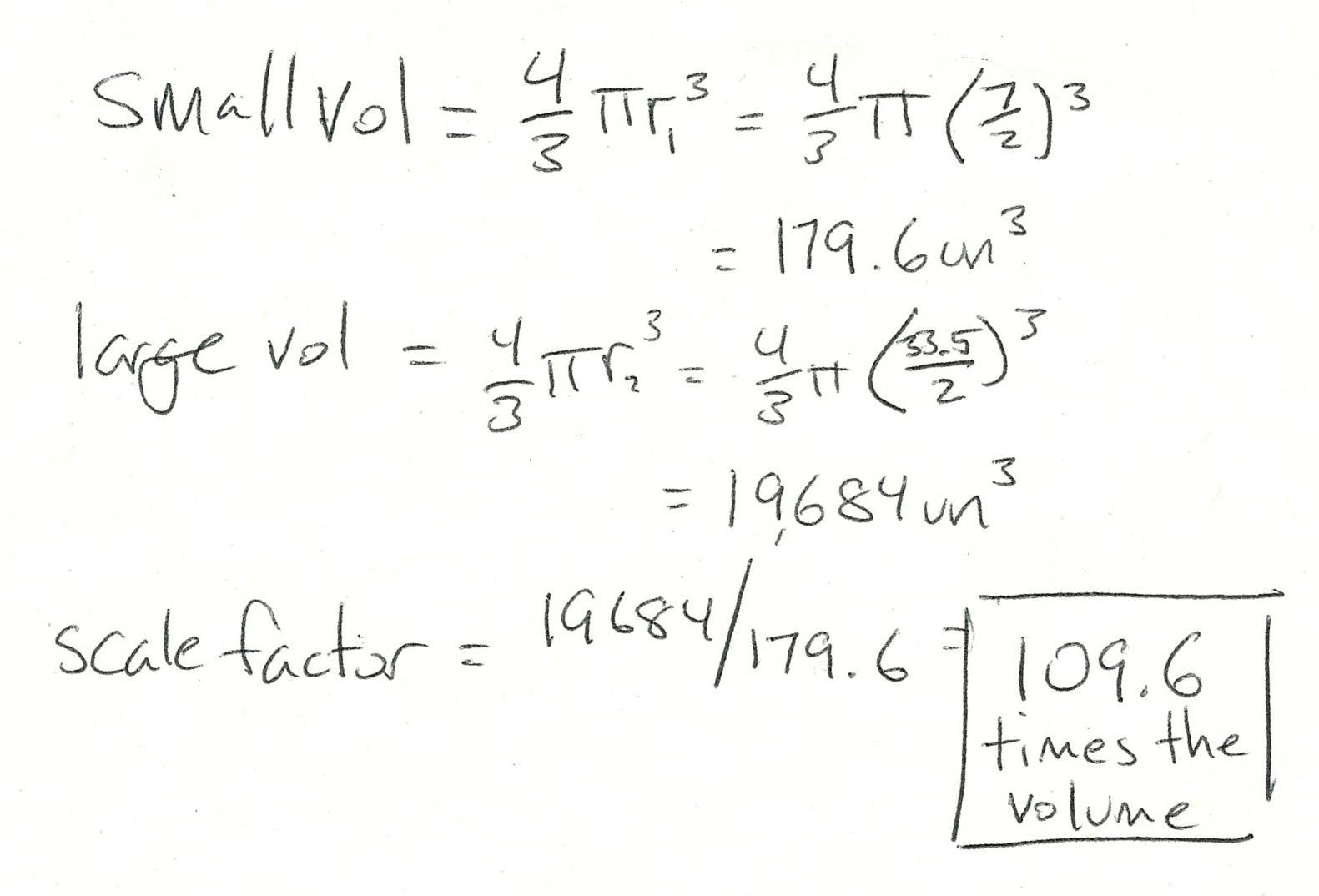Ideally, you’ll move from the relatively laborious calculation of volume to the relatively simple comparison of the diameters using scale proportions. ie. if the large volume is really 150 times the small, then the large radius has to be at least 150^(1/3) = 5.3 times the small.