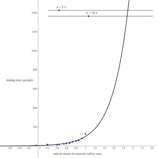 Use the Geogebra file, which graphs the melting time of the block against its ratio of volume to exposed surface area. Have them adjust the parameters until they have a good fit. Discuss the meaning of the parameters.