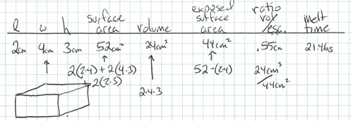 Using the measurement images, have the students create a table including the dimensions, the total surface area, the exposed surface area, the volume, the ratios between them, and the melting time for the block. Include the big block whose melting time we don’t know.