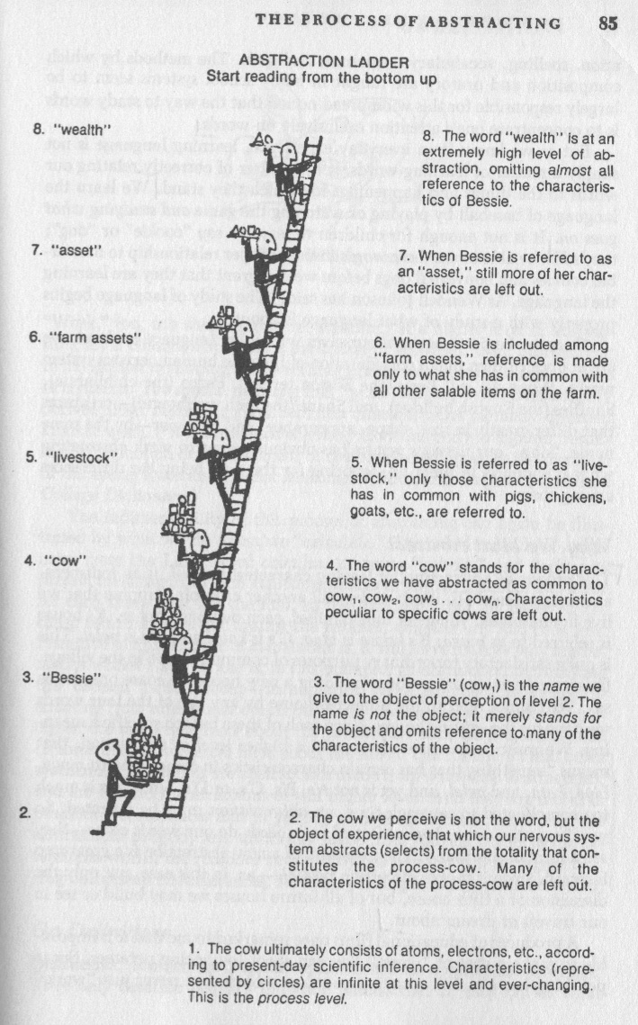 That’s a concrete example of the process and ladder of abstraction. The adjectives “concrete” and “abstract” just aren’t all that useful here. Everything is concrete if you think about the rungs above it and everything is abstract when you think about the rungs below it. The photograph that kicks off the post is more concrete than everything that comes after it but it’s also more abstract than the full-bleed, full-audio, moving panorama you experienced as you walked across the street. What matters isn’t the rung itself but how deftly you can move between all the rungs above and below you on the ladder of abstraction.