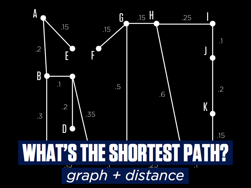 Great. But not perfect. This representation will only tell us whether or not it’s possible to get from one point to another –Â whether a route exists. If we want to find the shortest route, we add another useful variable, “abstracting over distance,” at it’s said.