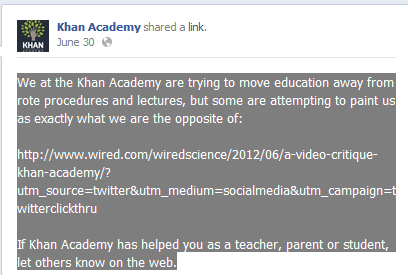 Before y’all get out your flamethrowers and head to the comments, I’d like to say a few things. I’m neither vitriolic, panicked, nor bitter about Khan Academy. I think it’s a great resource and it’s an excellent place to see a demonstration of procedures. I send my own students to it during exam review time, and they report that it is helpful.