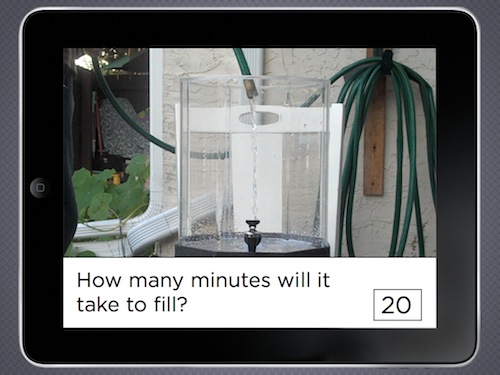 This is going to get really fun here. Obviously I will ask you, “How deep do you think it is?” That will happen. But even better is this. I’m going to ask you to tap on the screen when you think the rock hits the ground. And I can’t have you do that. [This part makes no sense on paper but it’s pretty awesome in the video –dm] But I’m going to ask you to raise your hand when you think the rock hits the ground.