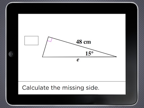 Calculate the missing side. And we do this very interesting thing on these problems where the student gets an answer and we go around and we look at the answers. When the answer is wrong, we ask, “Does your answer make sense? Is your answer reasonable?” It has the effect of stigmatizing that question, of course, so they know “Is your answer reasonable?” means “Your answer is wrong.” But it’s interesting when we ask that question. We ask that question once they’ve climbed to the very highest rung on the ladder. They’ve selected a model. They’ve performed the operation. They are way high up there. And we ask them to climb on down and access the lowest rung on the ladder. “Is your answer guessable, reasonable? Does your intuition say, ‘Yeah, it works.'”