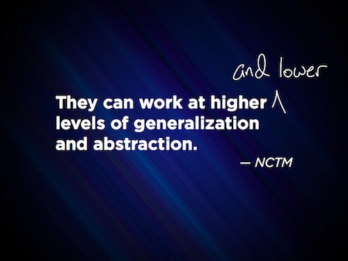 This is NCTM on technology and I think they got it exactly half right. The technology helps us work at higher levels of abstraction but technology also helps us work at lower levels of abstraction. Right now, the tasks we give students are focused on this narrow band, this narrow set of rungs in the middle of that ladder and no higher and no lower.