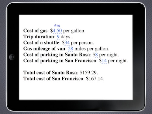 But he created this tool he calls Tangle and I adapted it for use in this problem. And what it lets me do is essentially turn all those parameters into variables and so now once I’ve solved the first problem, I can slide around on all those things and see what would happen if gas dropped in price or if the shuttle costs went up or if the cost of parking in Santa Rosa dropped to zero. And ask a whole host of new, different, complicated questions. And pose scenarios that are higher up on the ladder of abstraction.
