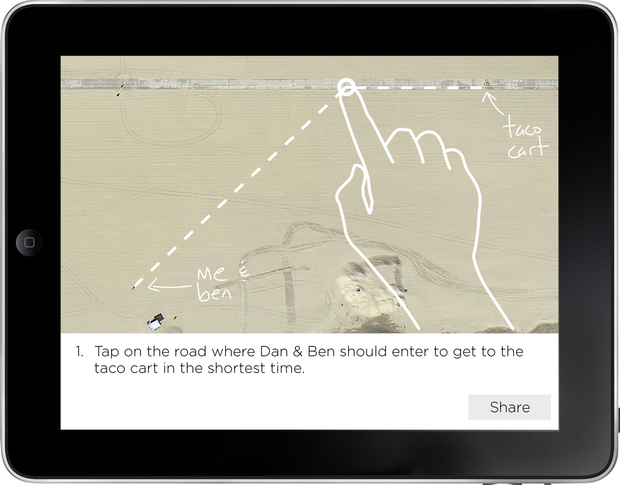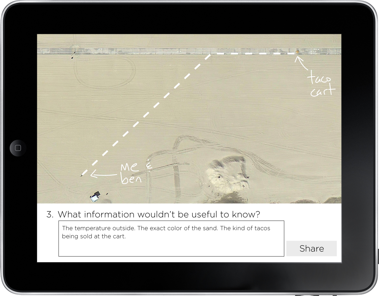 Currently, I’m asking students to guess where Ben and I should enter the roadway to get to the taco cart as fast as possible. But how do they register that guess? Do they point to it? Do they make a mark on a printout of the scene?