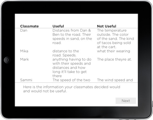 But, as you say, this lesson presupposes every student as an iPad or other tablet, and they’re all networked together. Apple’s puts tight restrictions on what you want to do, as far as sharing “code” and so forth. Android is an underdog and highly fragmented. The first obstacle to creating the tool isn’t the code, it’s finding an environment to write the code in, given the companies, products, languages, and so on we have to deal with in the real world. (If every tablet was identical and open, we’d have a much easier time.)