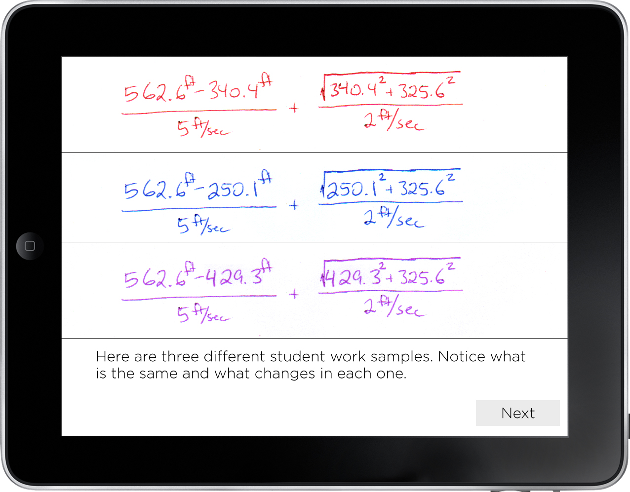 We pull out three student pages (never mind that these are all from the same person) and we ask the students to notice what changes and what doesn’t.