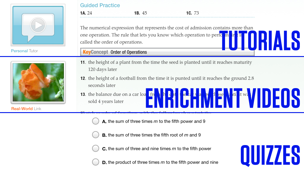 Algebra, as designed by McGraw-Hill for iBooks 2, is lighter by pounds. It’s indexed for search. It’s quick. You can highlight the text and insert notes. It removes one layer of abstraction between students and tools that already existed. Rather than accessing quizzes, tutorials, and enrichment videos by loading a CD-ROM into a computer or entering a password into a website, they’re a tap away.