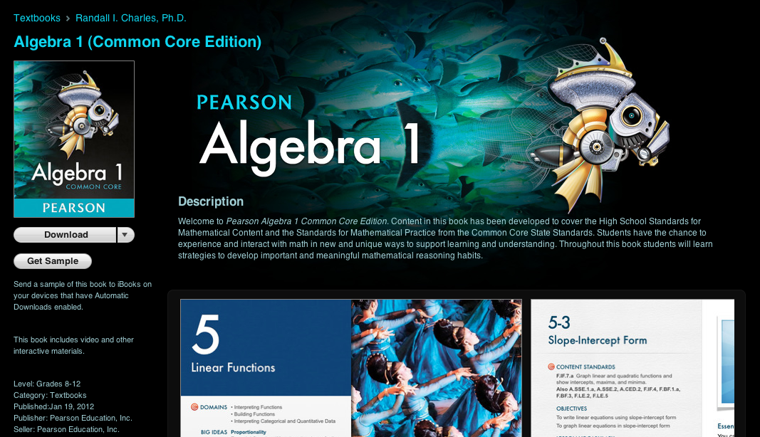 [Full disclosure: I’m a consultant for the Pearson Foundation on a different iPad project that’s still in production. Pearson has an Algebra 1 iBook that I haven’t reviewed here, only because I’m having a miserable time downloading these iBooks. The fact that its digital cover is the same as its print cover doesn’t exactly flood me with confidence, though. What they say about books and their covers, of course.]