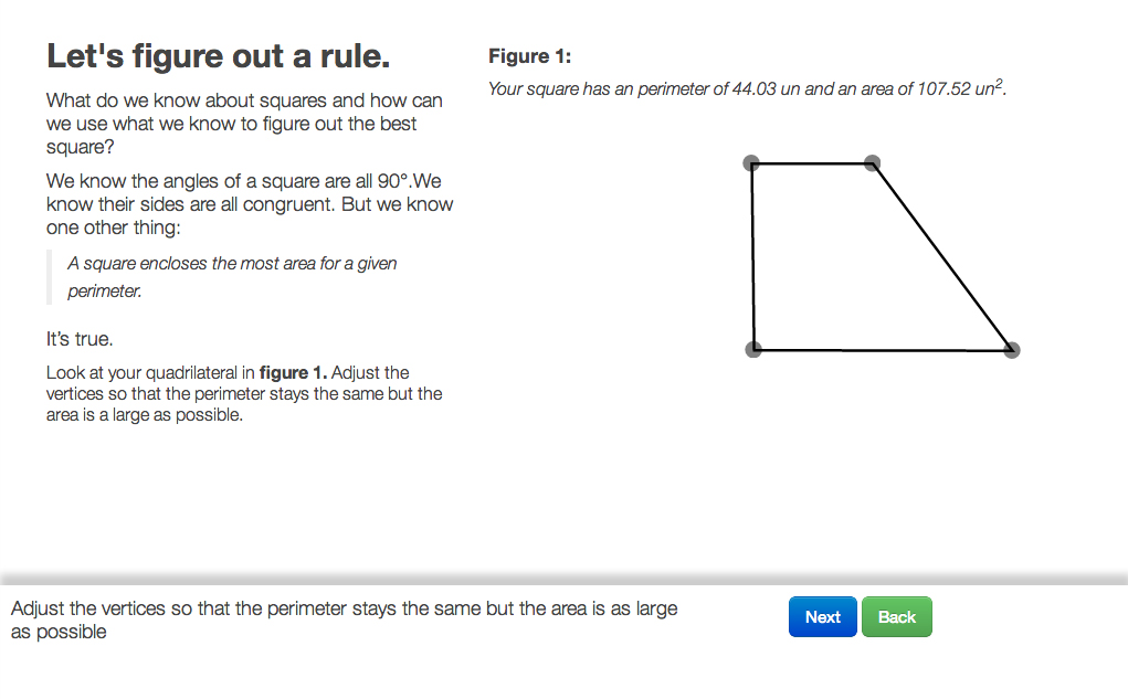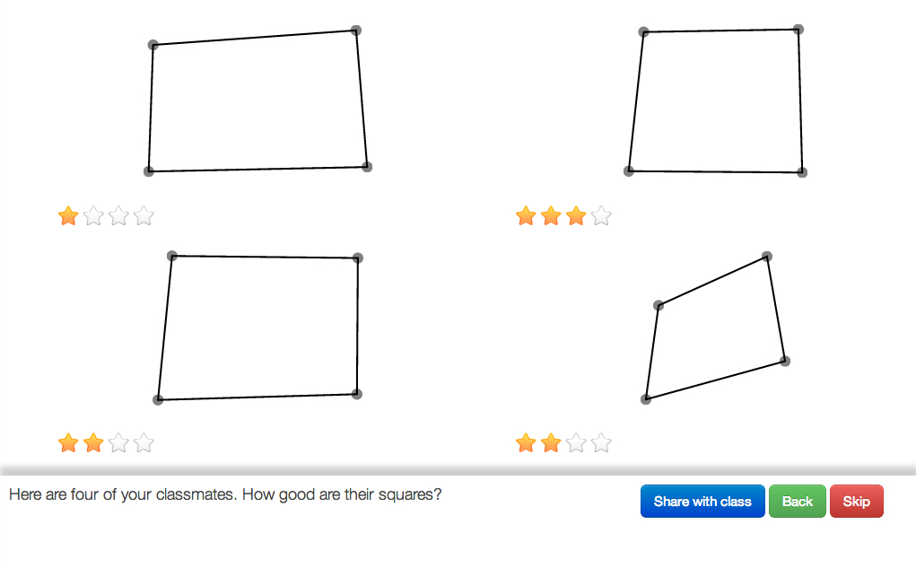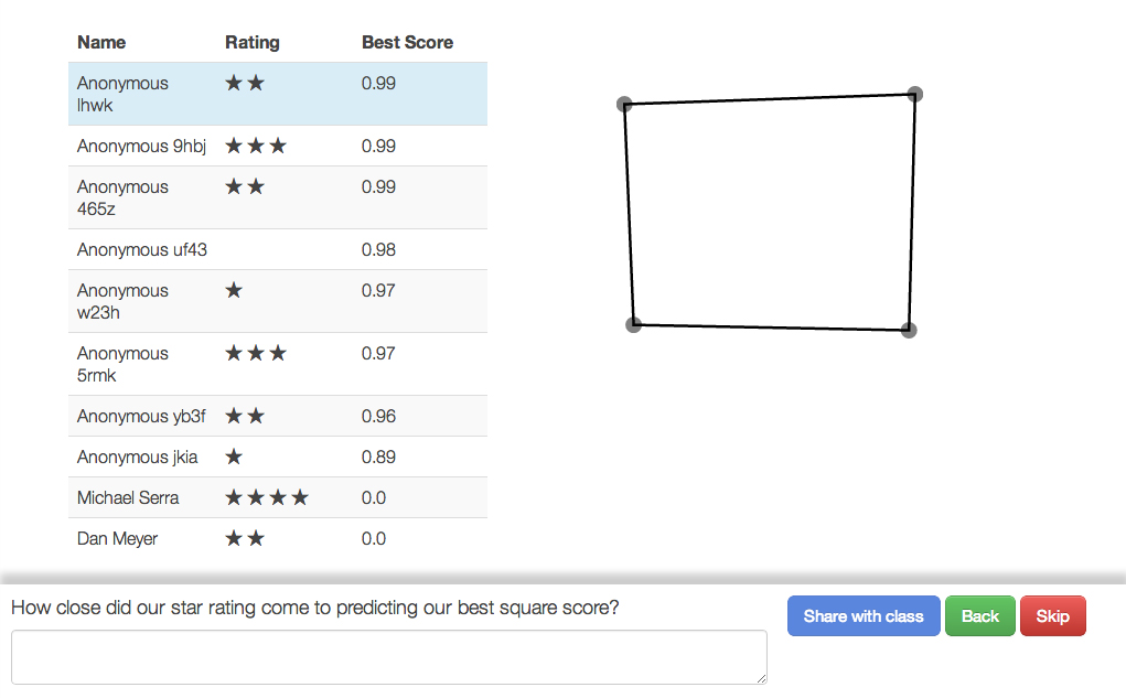 Don’t like our definition of “best square” as being the ratio of areas? Submit your own. The system will accept your formula, send it to the teacher, and then use it to rank the entire class’ quadrilaterals.
