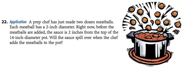 - Raise the ceiling on the task. My usual strategy of swapping the knowns and unknowns to create an extension task is failing me here. Watch what that looks like: “The chef adds 50 meatballs to a different pot and it overflows. Tell me about that pot and its sauce level.” I’m not proud of myself. Can you find me a better extension? I’ll give highest marks to extensions that build on the context we’ve already worked to set up (ie. don’t go running off to bowling balls and swimming pools) and that further develop the concept of volume of spheres and cylinders (ie. don’t go running off to cubes or frustums).