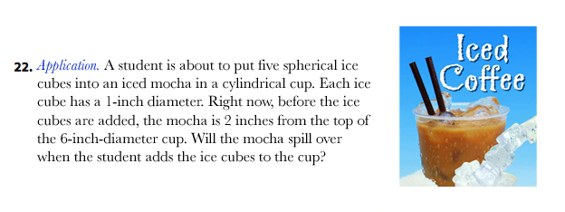 - Scott McDaniel suggests changing the context from meatballs in sauce to ice cubes in an iced mocha because kids drink iced coffee but don’t make spaghetti. This introduces a pile of complications (like the non-spherical shape of the ice cubes and the non-cylindrical shape of the cup and the fact that the ice will float at the top of the cup) for unclear benefits. Time and again in this series I’ve tried to convince you that changing the context of a task does very little compared to the changes we can make to the task’s DNA. Does someone (Scott?) want to make the case that the following task is a significant improvement over the original?