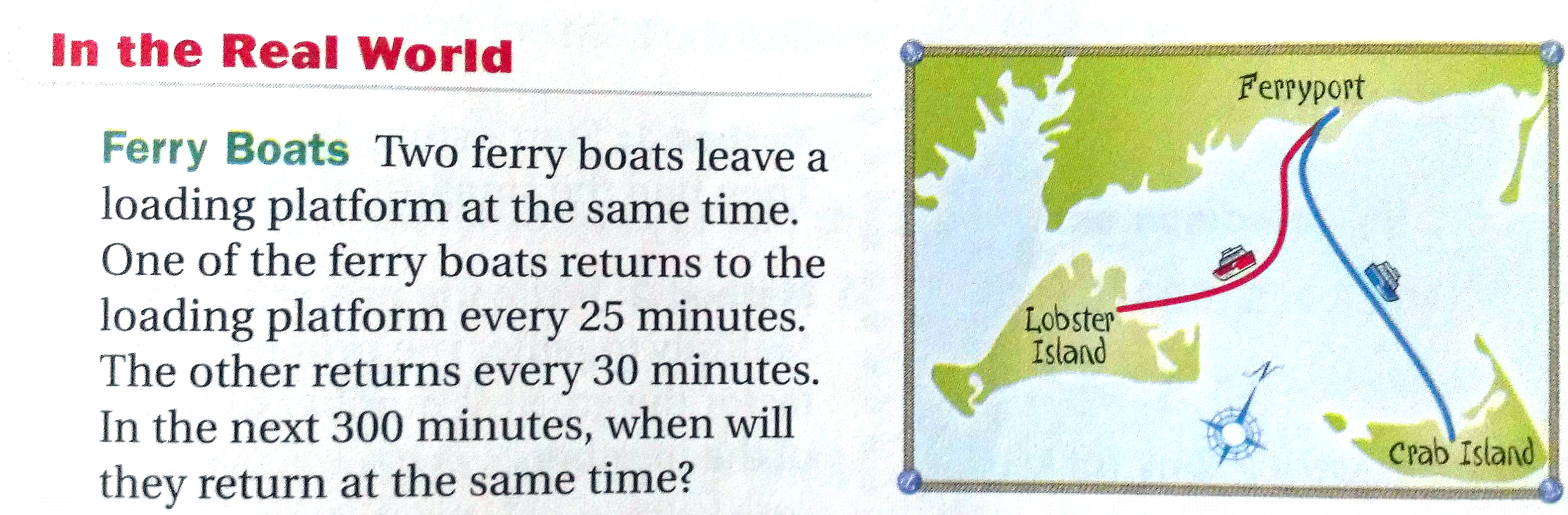 I’d ask them, first, if they thought the boats would ever return to shore at the same time. The task gives that answer away but, me, I’d rather get every possible conception on the table so long as it doesn’t cost me too much time. “If you think they’ll return at the same time,” I’d then ask them, “write down how long you think it’ll take to see that happen.”
