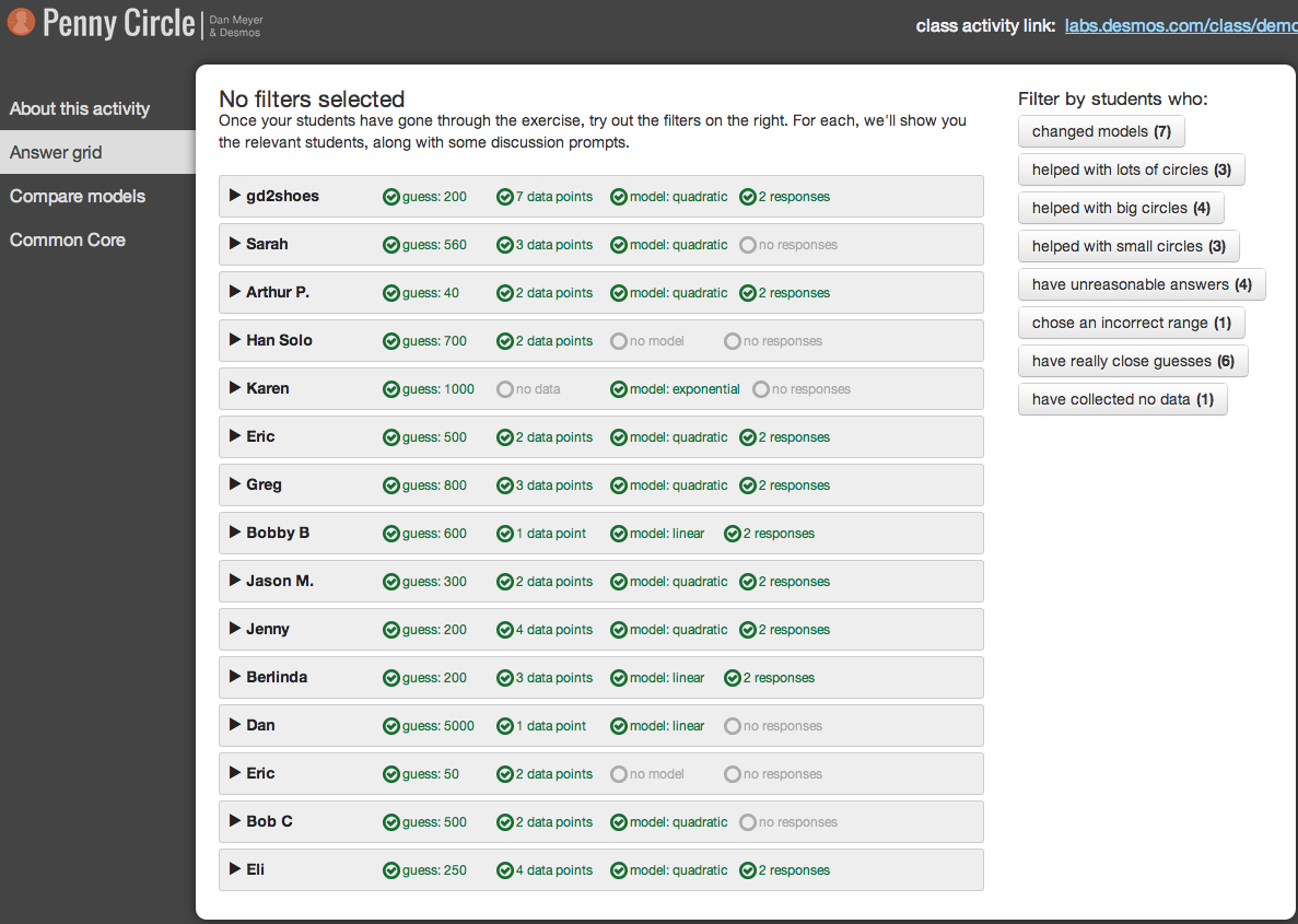 With the teacher dashboard on our pennies lesson, the Desmos team and I tried to fix those three problems.