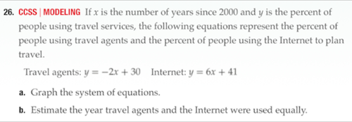 That is a huge list of important, valuable skills. The scary part is how little our curriculum helps students develop those skills. Here’s a task from Pearson’s Algebra I text, which is pretty typical in this regard:
