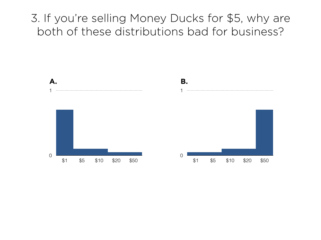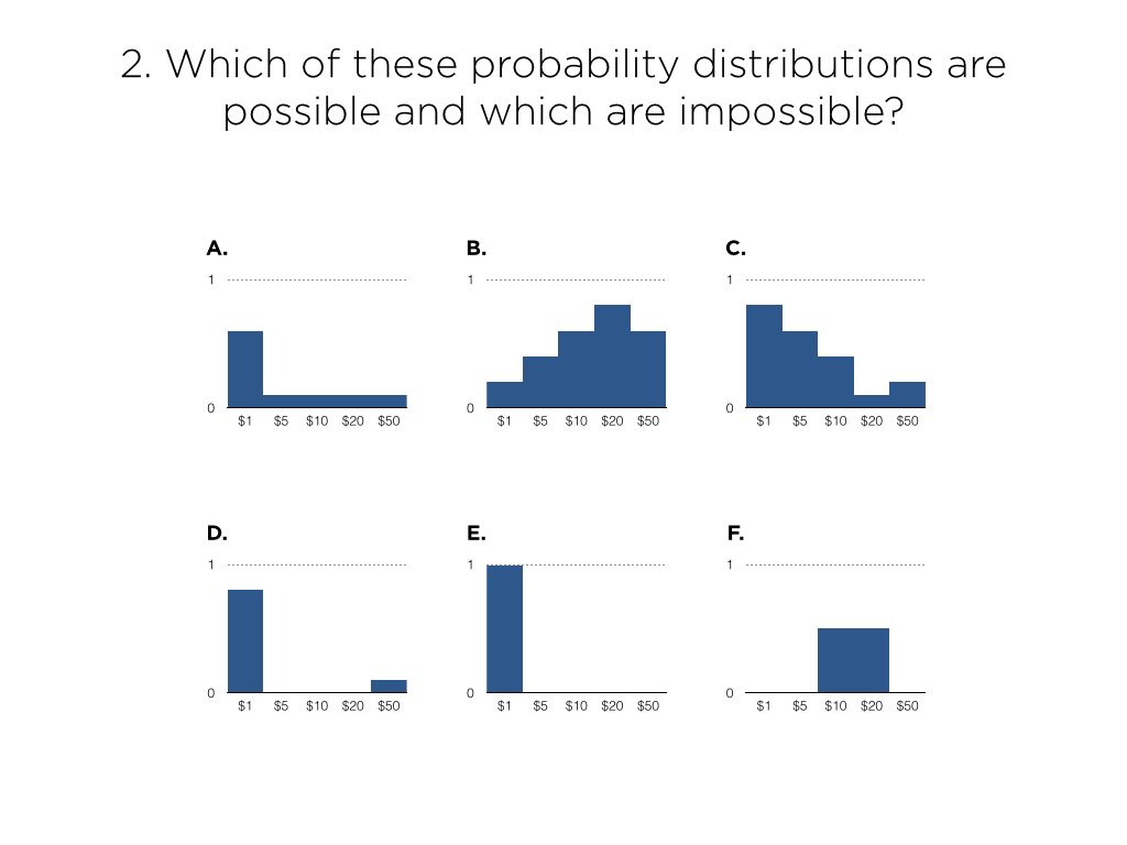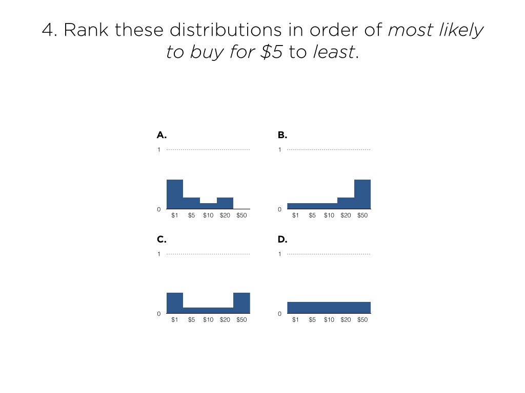 - Rank these distributions in order of “I’d definitely buy that for $5!” to “I definitely wouldn’t buy that for $5!”