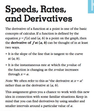 Brian Lawler responds that, yes, it’s possible to teach calculus without direct instruction, and offers up his Interactive Mathematics Program Year 3 unit “Small World” as evidence. Pulling out my copy of IMP, though, I find pages in the Small World unit that directly instruct students in the calculation of slope, the calculation of average rate of change, and the definition of the derivative. This appears to answer Chester’s question, “Do constructivist teachers quietly just directly instruct for such topics?”