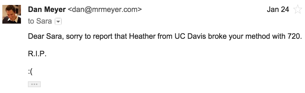 Once someone successfully critiqued the algorithm — and every single algorithm has been successfully critiqued — we emailed the author and alerted her. Subject line: RIP Your Algorithm.