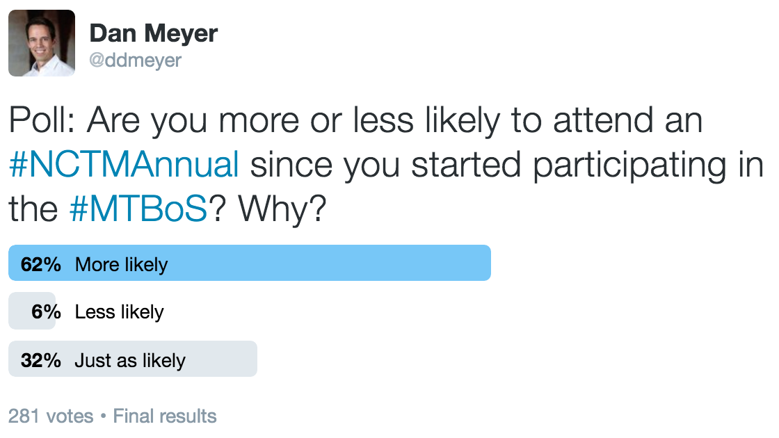 Early Friday morning of NCTM, I attended a focus group to discuss the future of NCTM and more specifically, their partnership with the Math Forum. Many issues were discussed including the ones you bring up here. But one that seemed to resonate with everyone in attendance was the people who work for the Math Forum. Joining the Math Forum and NCTM has given NCTM a face and a personality exemplified through the wonderful people that make up the Math Forum. They have helped bridge the divide, physically and metaphorically, between NCTM and the greater Math Twitter Blogosphere and have been a catalyst for the continuing conversation between these groups.