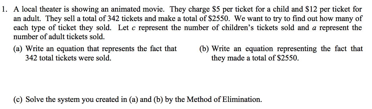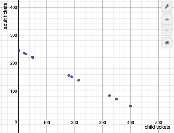 From there, I’m inclined to take Sunday’s sum (one he wasn’t lying about) and ask students how they know it might be legitimate. They’ll offer different pairs of child and adult tickets. “My no-good kid brother says he sold 342 tickets. Can you tell me if that’s possible?”