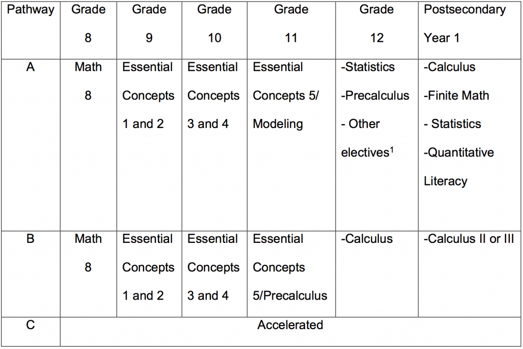 NCTM proposes that all students take four years of math in high school. 2.5 of those years will comprise “essential concepts,” taken by every student regardless of career or college aspiration. Students may then take one of two paths through their remaining 1.5 years, one towards calculus, the other towards statistics and other electives.