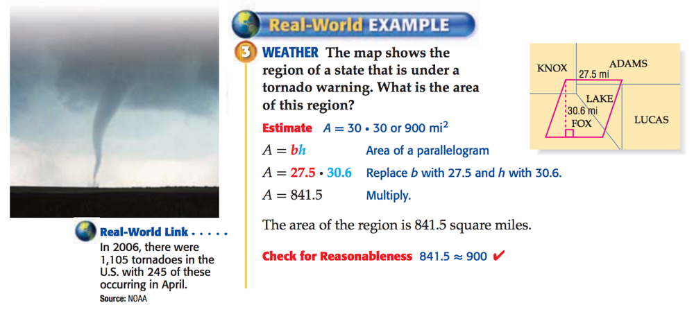 January 8, 2017 - 7:26 pm -Actually in the context of this problem, they may actually have a winner here. Note the parallelogram represent an area the meteorologists have set as an area under tornado warning, meaning that a tornado is present in the area or imminent. Thus the area represents where tornadoes may appear, not the area that will be damaged by a tornado. Here is an example close to the textbook problem, illustrates a trapezoid not a parallelogram, but you get the gist: http://bnonews.com/news/index.php/news/id4419
