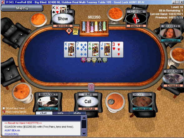 There are other, better places to get the full story on this one. (See the references below.) The important details to my math class are these. Absolute Poker keeps superuser accounts which can see every hole card at the table. Someone within Absolute Poker accessed that account and sat in on every game played by another user, informing that user’s every call, bluff, and raise perfectly, resulting in some extremely wild gambles, gambles like taking a weak hand like king high to the river on a table with plenty of other action, gambles which a sane person would make only if he knew what every person at the table held.