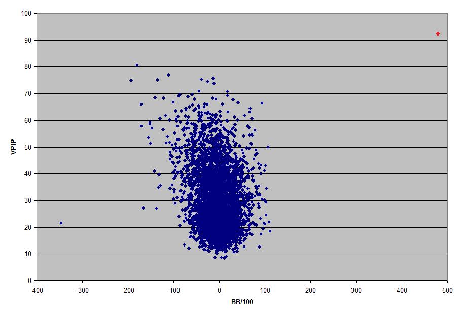 Each dot represents a poker player at the online poker supersite Absolute Poker, based out of Costa Rica, specifically the 5000 players who play the most hands.