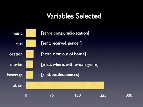 NF: Unfortunately, not enough data comes from passive sources yet… probably less than 10% of last year’s report was captured in that way. As you mention, last.fm keeps tabs on all my listening through itunes and my ipod. I let netflix keep track of the movies I rent, and flickr tracks how many people have viewed my photos. I have also purchased weather records for New York City, which I augment with out of town records for the last 2 years in order to help determine my average temperature as well as the maximum and minimum.