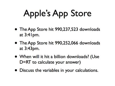 I’m not trying to set up a false dichotomy here. We do both. Both are important. But all too often slides like that first one, with the classroom dialogue and solution method predetermined, cordon off classroom dialogue and student reflection onto very narrow paths. That kind of pedagogy does nothing to unify mathematics, tending, instead, to position complex procedures in isolation from each other, which is a very confusing way to learn math and a very laborious way to teach it.