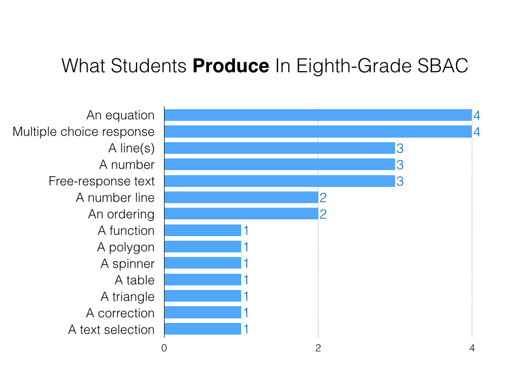 This brief analysis has revealed that Khan Academy students are doing two primary kinds of work (analysis and calculating) and they’re expressing that work in two primary ways (as multiple-choice responses and as numbers). Meanwhile, the SBAC assessment of the CCSS emphasizes a different set of work and asks for more diverse expression of that work.