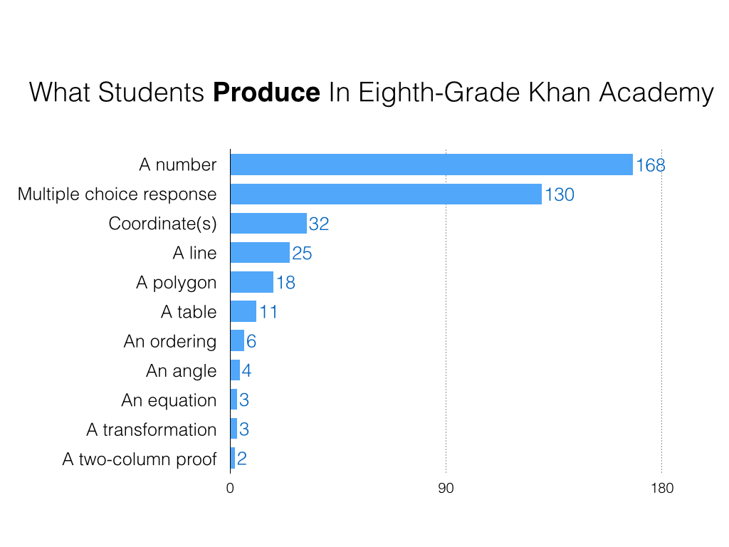 tl;dr — Khan Academy claims alignment with the Common Core State Standards (CCSS) but an analysis of their eighth-grade year indicates that alignment is loose. 40% of Khan Academy exercises assessed the acts of calculating and solving whereas the Smarter Balanced Assessment Consortium’s assessment of the CCSS emphasized those acts in only 25% of their released items. 74% of Khan Academy’s exercises resulted in the production of either a number or a multiple-choice response, whereas those outputs accounted for only 25% of the SBAC assessment.