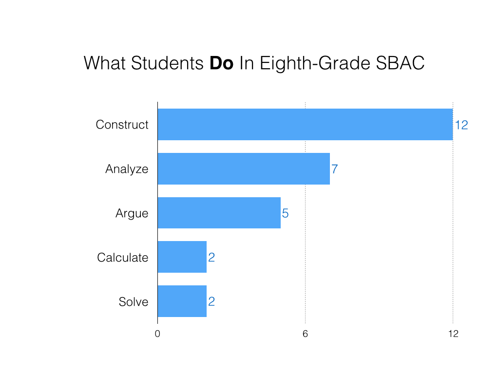 The Smarter Balanced released items ask comparatively fewer “calculate” and “solve” items (they’re the least common verbs, in fact) and comparatively more “construct,” “analyze,” and “argue.”